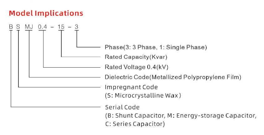 Cuando un fabricante sigue completamente esta regla para producir un capacitor en derivación utilizando impregnación de cera microcristalina y dieléctrico de película de polipropileno metalizado, la designación de serie resultante es naturalmente BSMJ. Por lo tanto, la serie BSMJ se ha convertido en una de las más utilizadas, que más cumple con las reglas de nomenclatura estándar de la industria de maquinaria nacional china y con las designaciones de series de capacitores en derivación autorreparantes de bajo voltaje más reconocidas en el mercado chino a lo largo de los años.